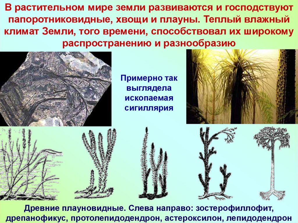 В растительном мире земли развиваются и господствуютпапоротниковидные, хвощи и плауны. Теплый влажный