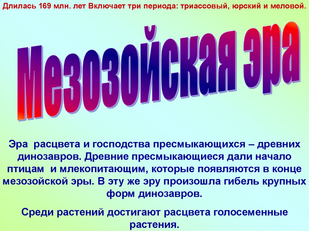 Длилась 169 млн. лет Включает три периода: триассовый, юрский и меловой.Эра расцвета и господства пресмыкающихся – древних