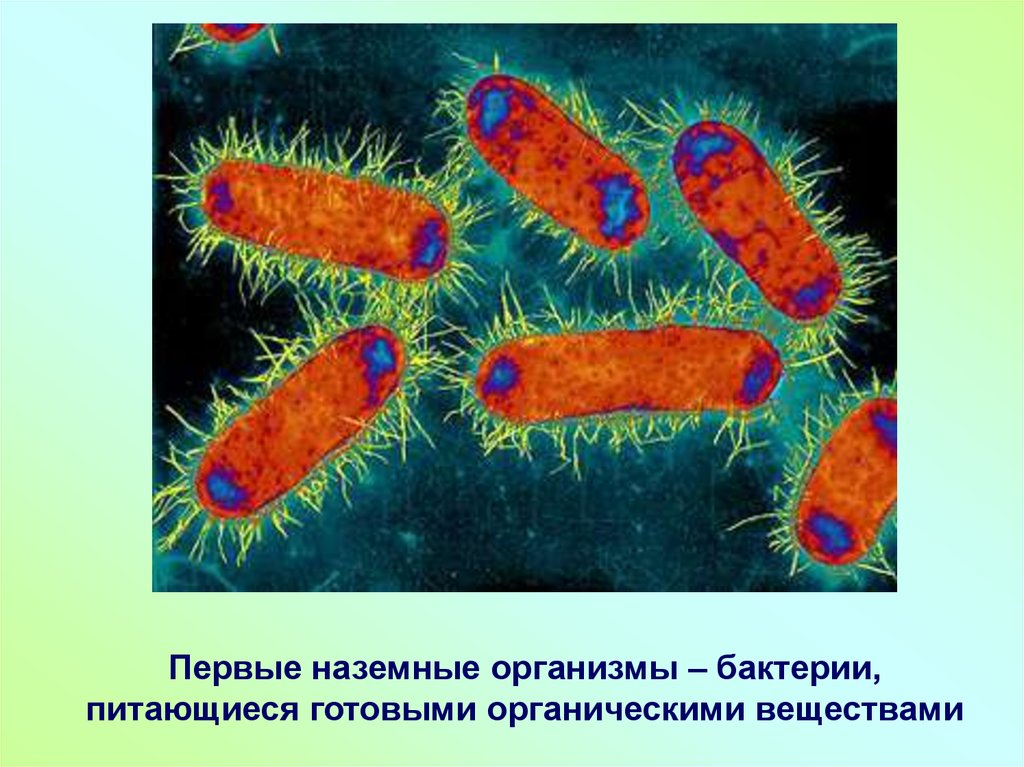 Первые наземные организмы – бактерии,питающиеся готовыми органическими веществами