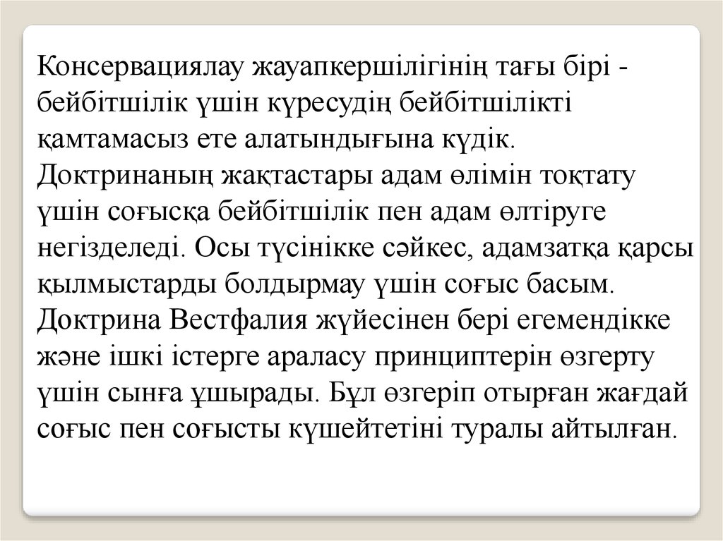 Консервациялау жауапкершілігінің тағы бірі бейбітшілік үшін күресудің бейбітшіліктіқамтамасыз ете алатындығына күдік.