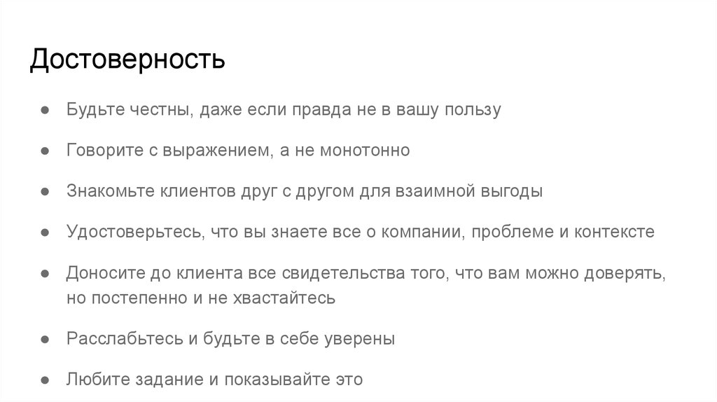 Достоверность● Будьте честны, даже если правда не в вашу пользу