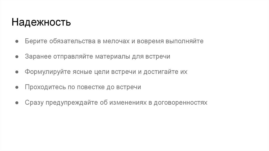 Надежность● Берите обязательства в мелочах и вовремя выполняйте