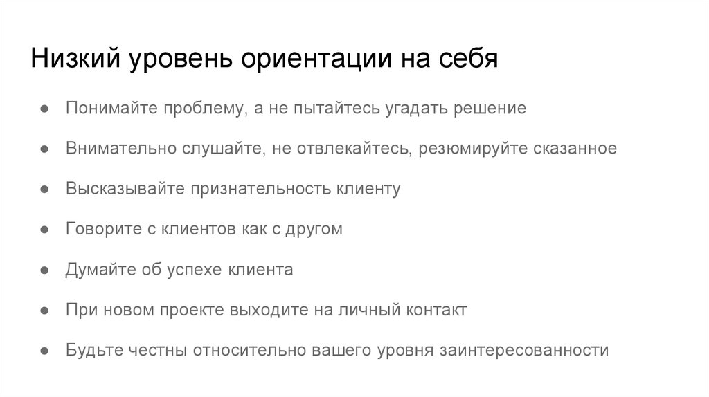 Низкий уровень ориентации на себя● Понимайте проблему, а не пытайтесь угадать решение