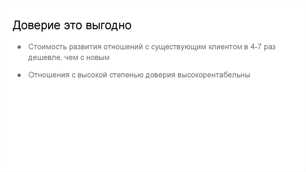 Доверие это выгодно● Стоимость развития отношений с существующим клиентом в 4-7 раз