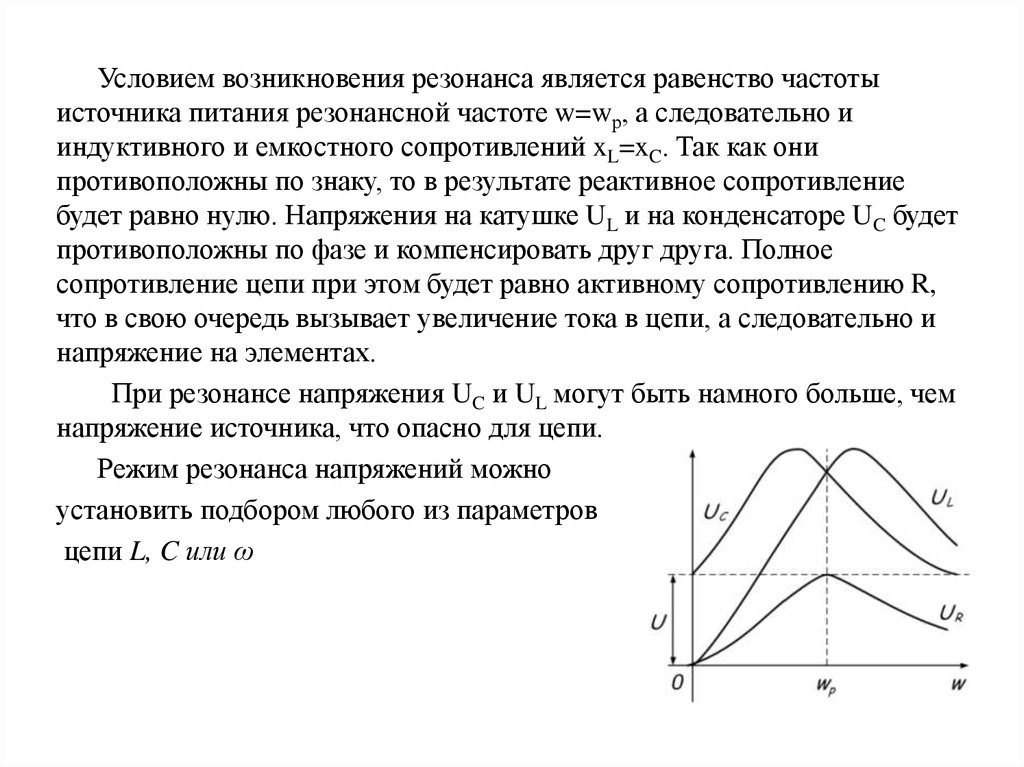 Условием возникновения резонанса является равенство частотыисточника питания резонансной частоте w=wр, а следовательно и
