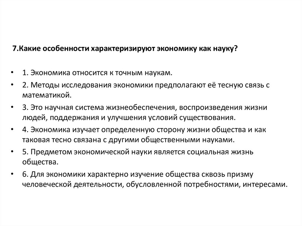 7.Какие особенности характеризируют экономику как науку?• 1. Экономика относится к точным наукам.
