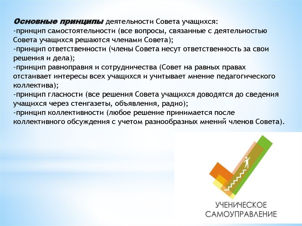 Основные принципы деятельности Совета учащихся:-принцип самостоятельности (все вопросы, связанные с деятельностью