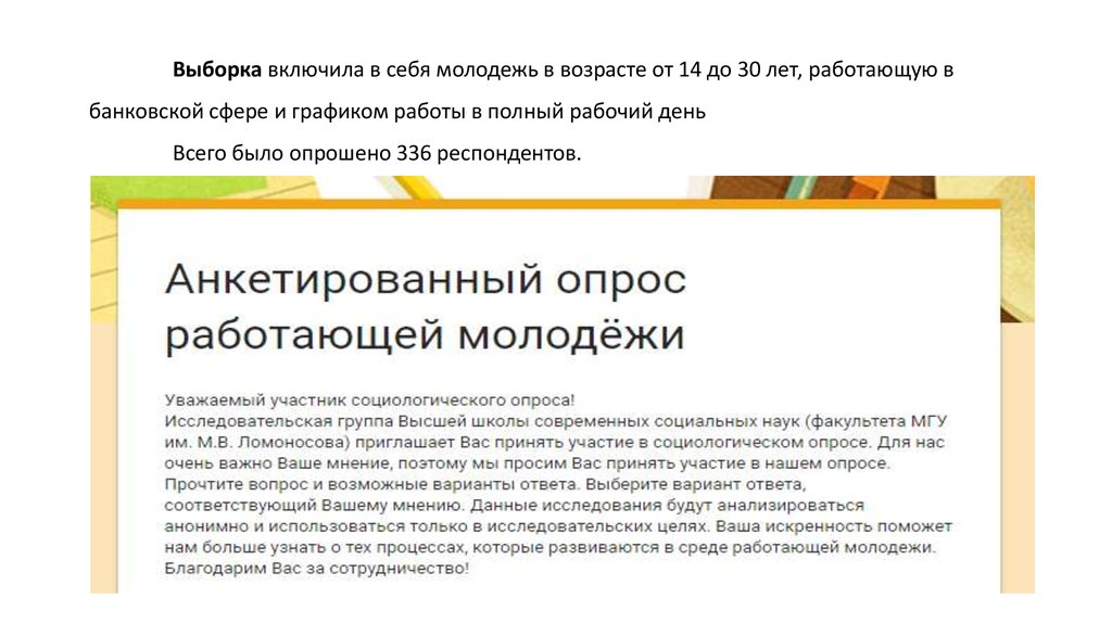 Выборка включила в себя молодежь в возрасте от 14 до 30 лет, работающую вбанковской сфере и графиком работы в полный рабочий день