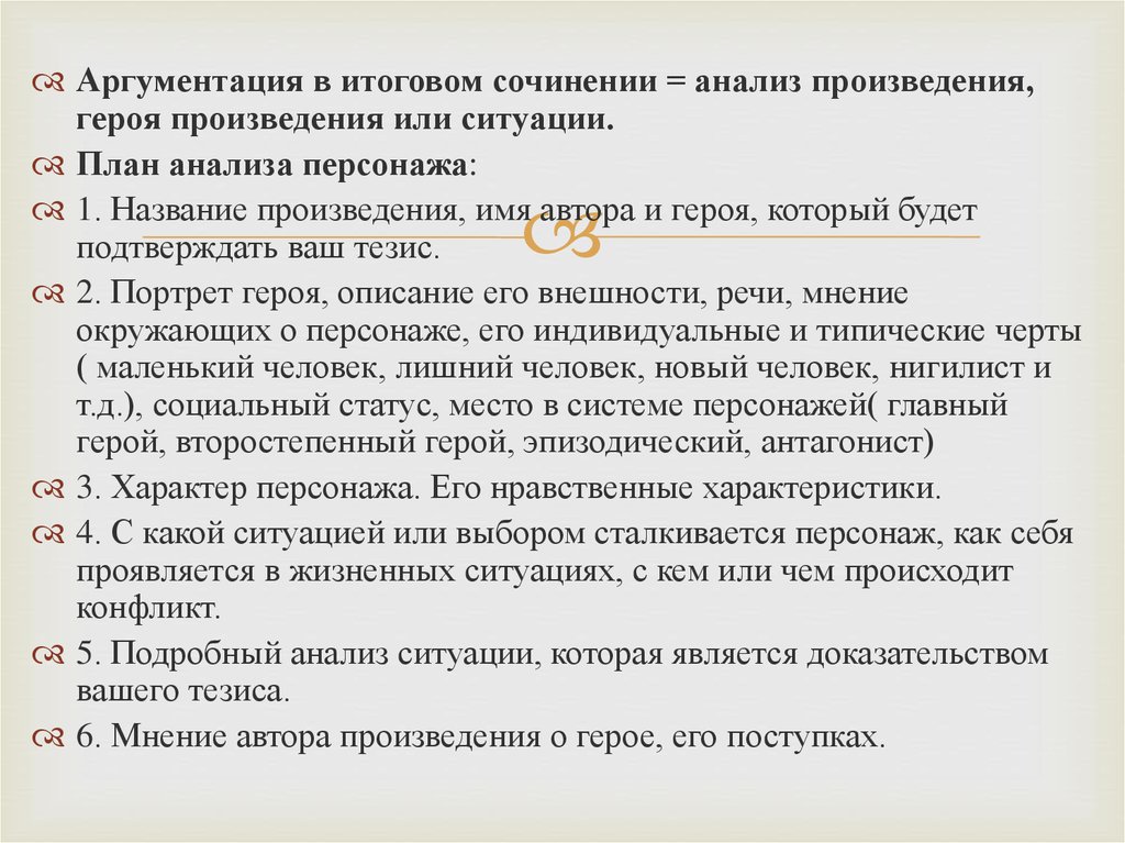 Аргументация в итоговом сочинении = анализ произведения,героя произведения или ситуации.