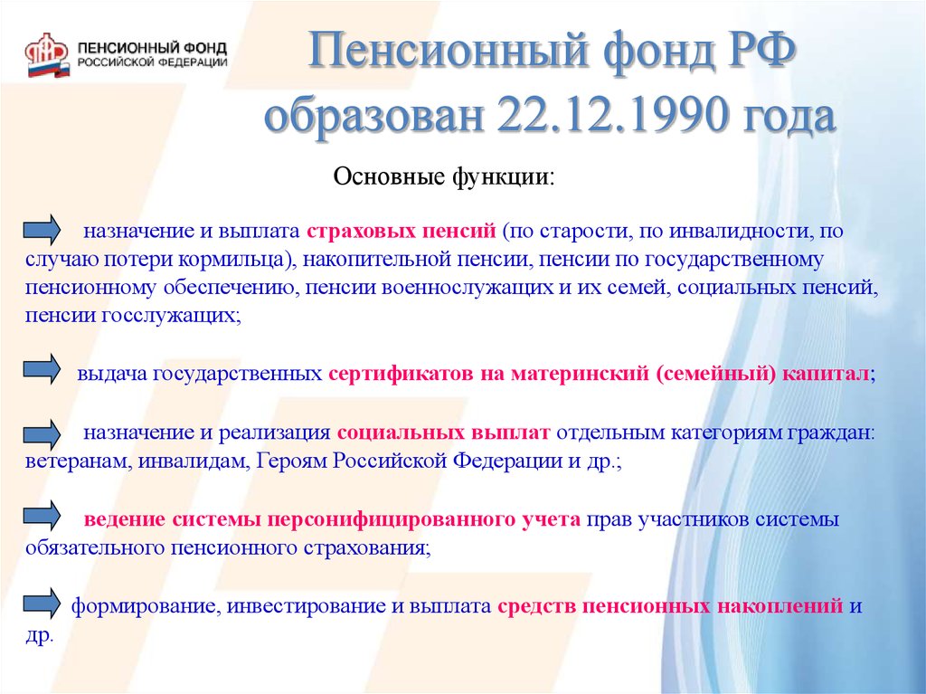Пенсионный фонд РФобразован 22.12.1990 года