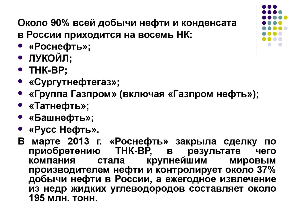 Около 90% всей добычи нефти и конденсатав России приходится на восемь НК: