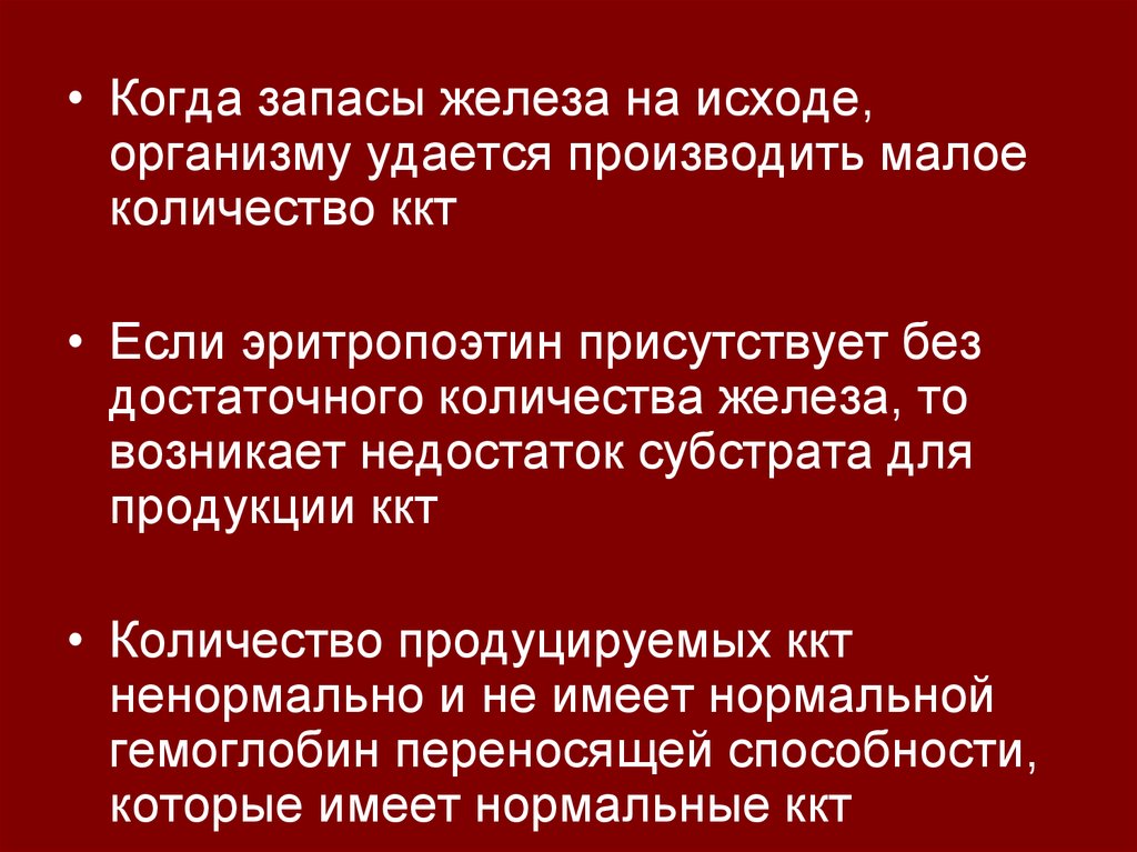 • Когда запасы железа на исходе,организму удается производить малое