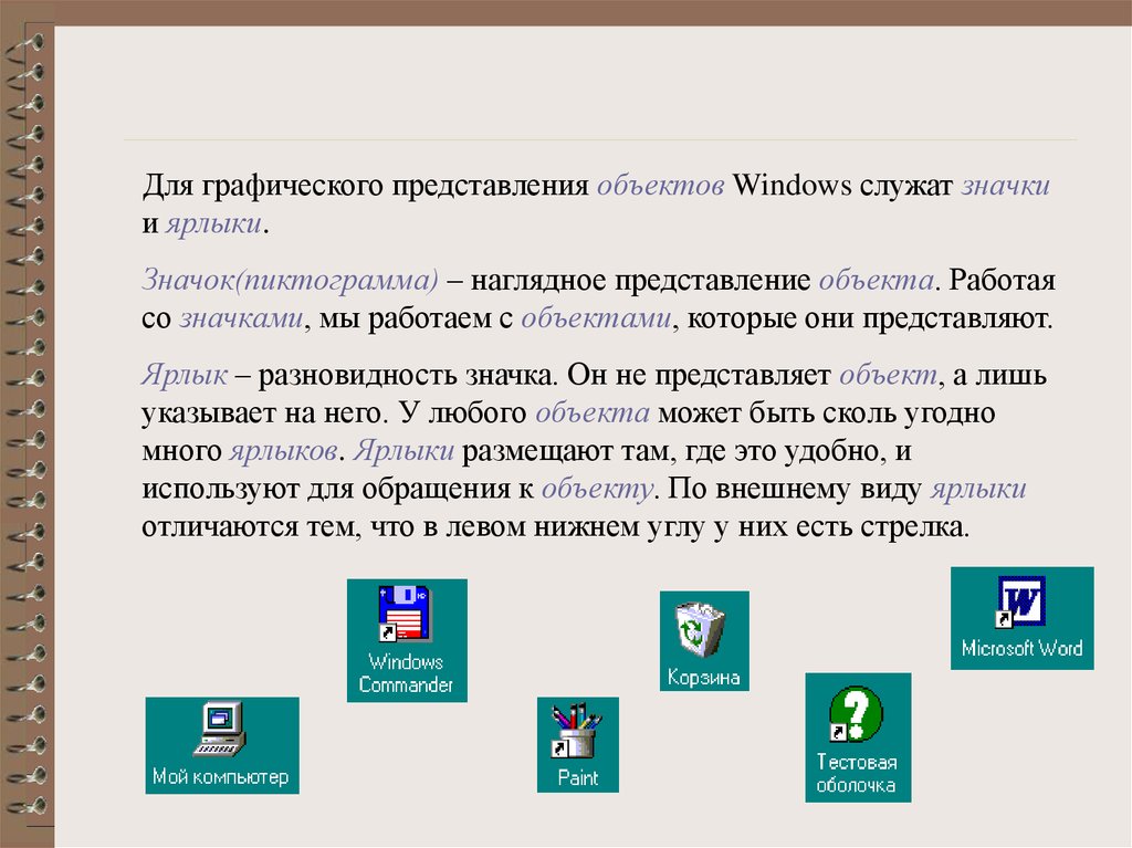 Для графического представления объектов Windows служат значкии ярлыки.