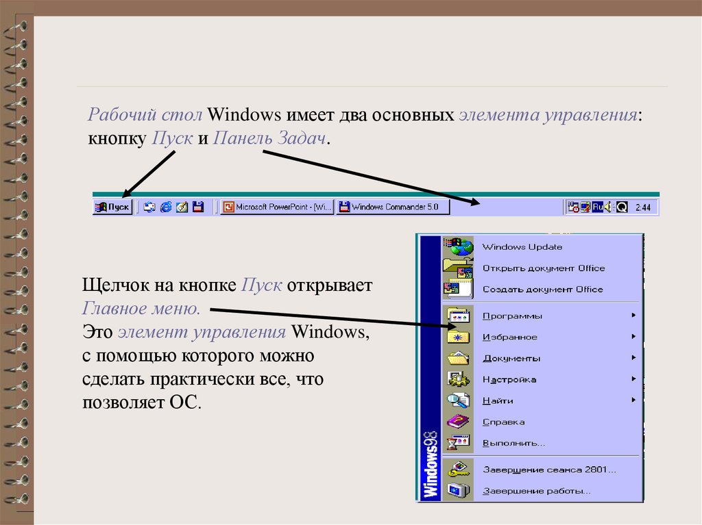 Рабочий стол Windows имеет два основных элемента управления:кнопку Пуск и Панель Задач.