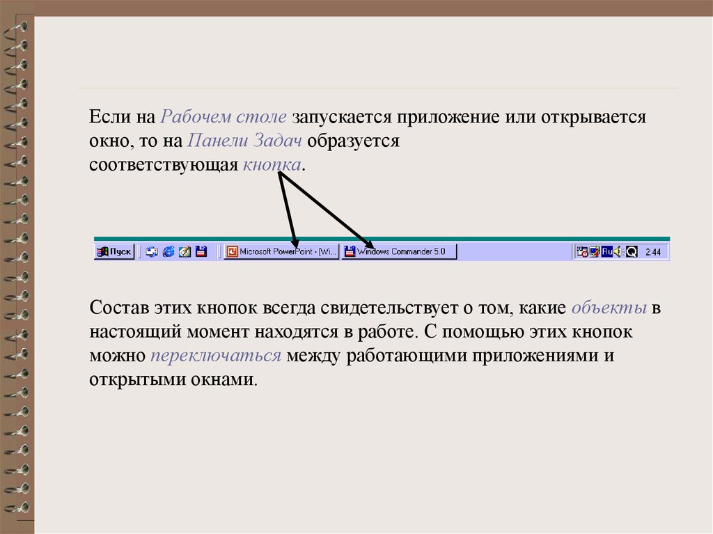 Если на Рабочем столе запускается приложение или открываетсяокно, то на Панели Задач образуется