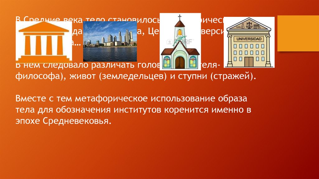 В Средние века тело становилось метафорическимобразом государства, города, Церкви, университета,