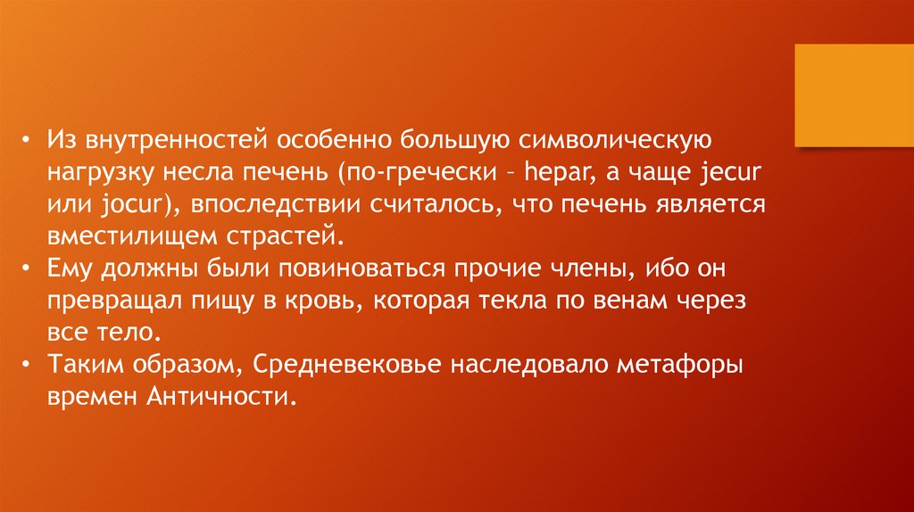 • Из внутренностей особенно большую символическуюнагрузку несла печень (по-гречески – hepar, а чаще jecur