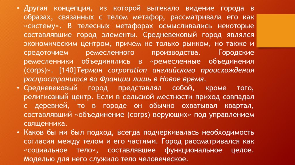 • Другая концепция, из которой вытекало видение города вобразах, связанных с телом метафор, рассматривала его как