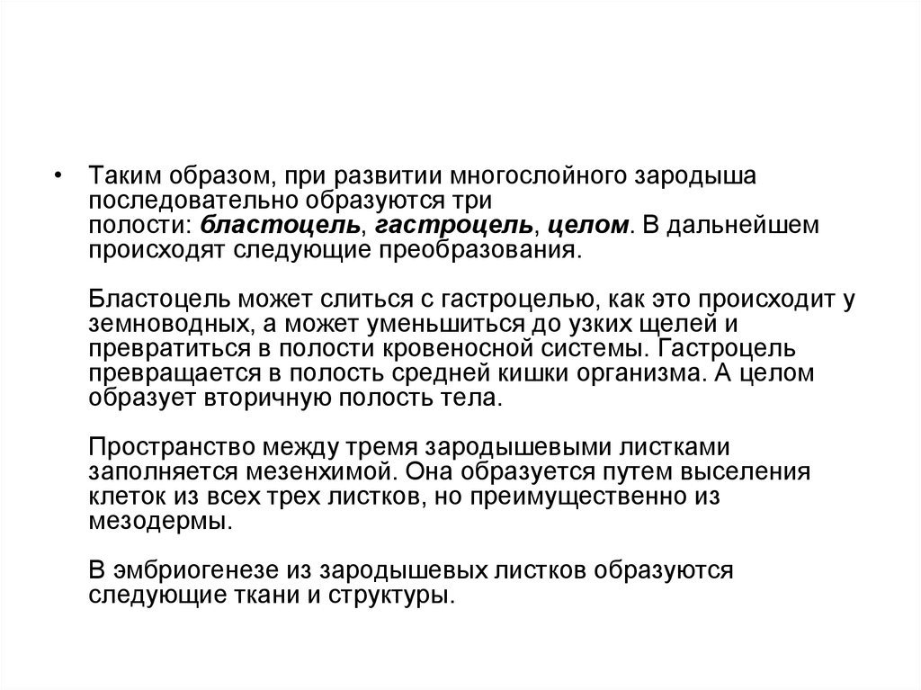 полости: бластоцель, гастроцель, целом. В дальнейшем