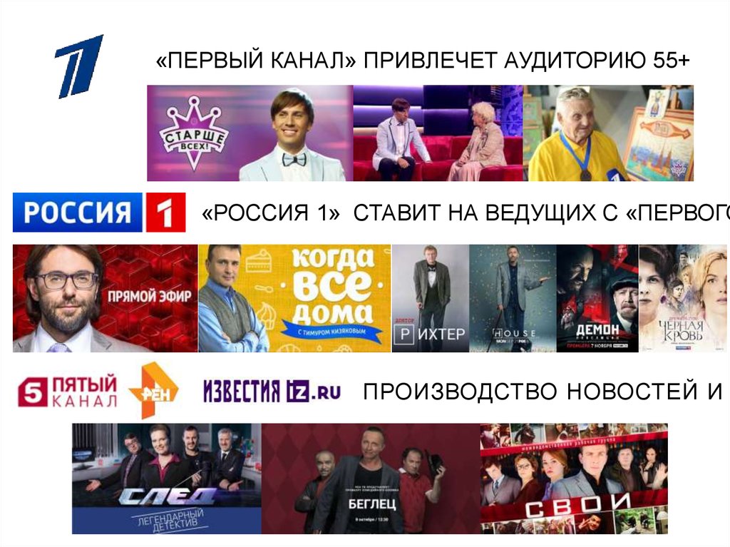«ПЕРВЫЙ КАНАЛ» ПРИВЛЕЧЕТ АУДИТОРИЮ 55+«РОССИЯ 1» СТАВИТ НА ВЕДУЩИХ С «ПЕРВОГО