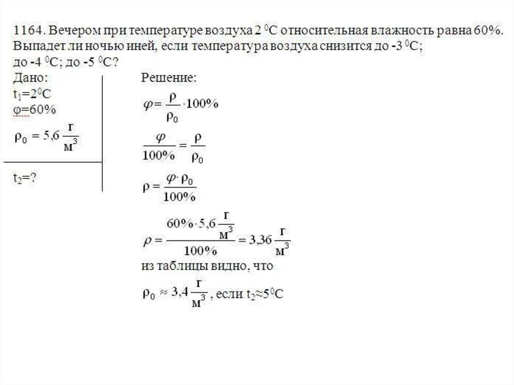 1164. Вечером при температуре воздуха 2 0С относительная влажность равна 60%.