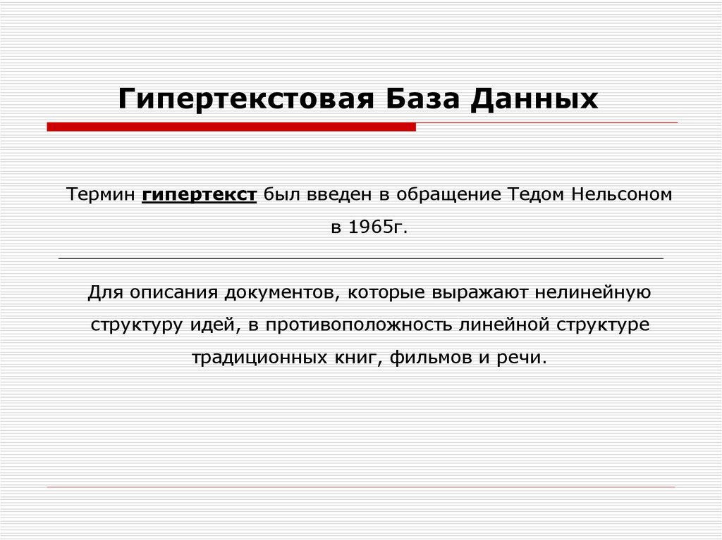 Гипертекстовая База ДанныхТермин гипертекст был введен в обращение Тедом Нельсоном