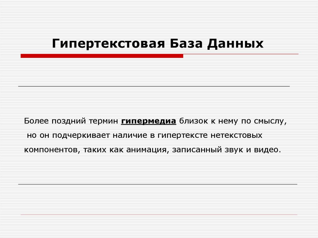 Гипертекстовая База ДанныхБолее поздний термин гипермедиа близок к нему по смыслу,
