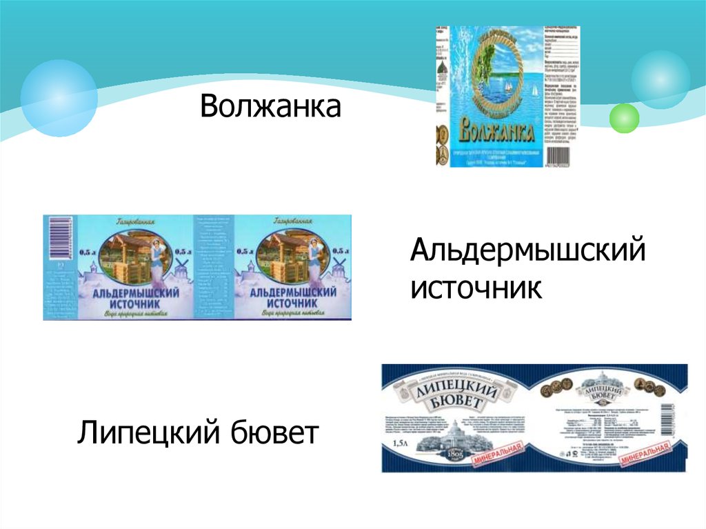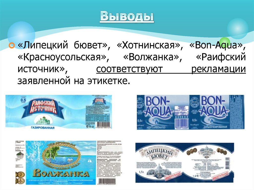 «Липецкий бювет», «Хотнинская», «Bon-Aqua»,«Красноусольская», «Волжанка», «Раифский