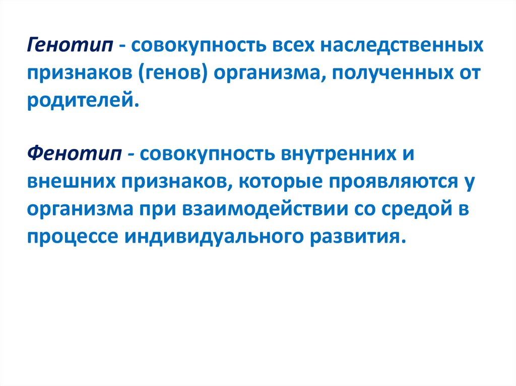 Генотип - совокупность всех наследственныхпризнаков (генов) организма, полученных от