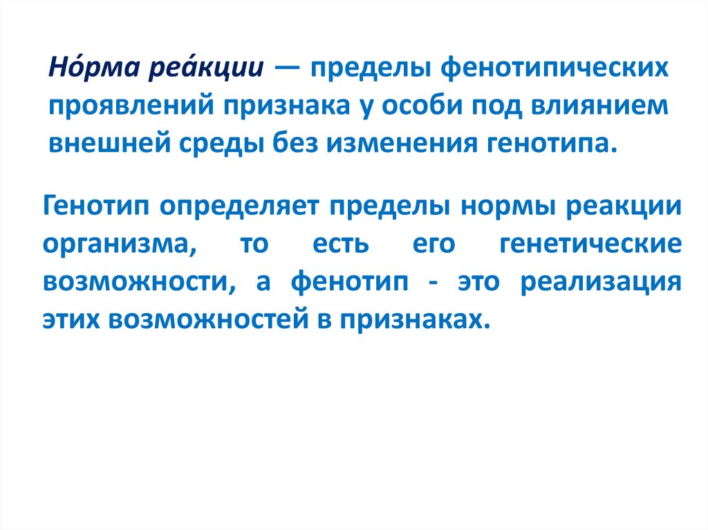Но́рма реа́кции — пределы фенотипическихпроявлений признака у особи под влиянием