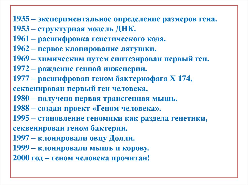 1935 – экспериментальное определение размеров гена.1953 – структурная модель ДНК.