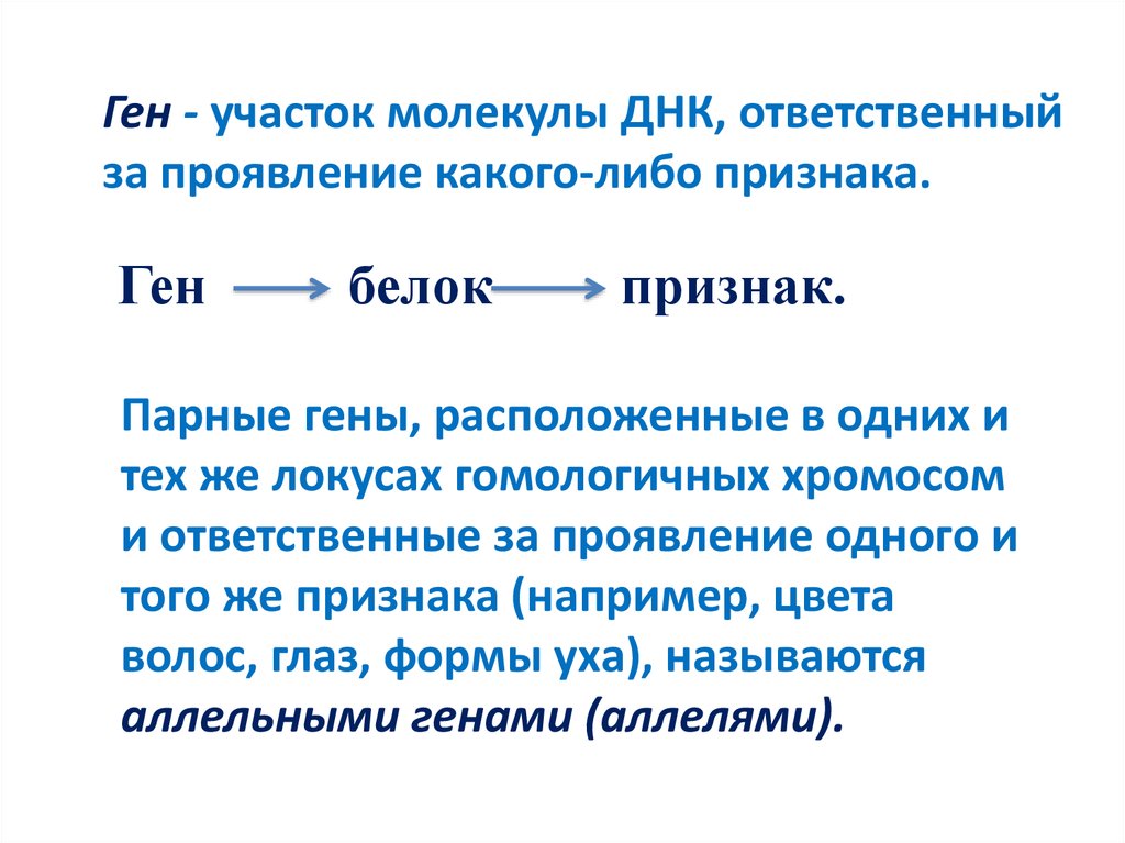 Ген - участок молекулы ДНК, ответственныйза проявление какого-либо признака.
