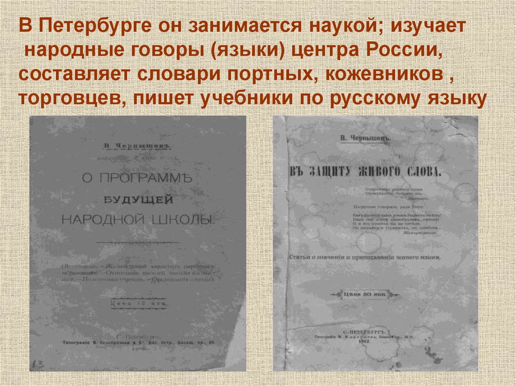 В Петербурге он занимается наукой; изучаетнародные говоры (языки) центра России,