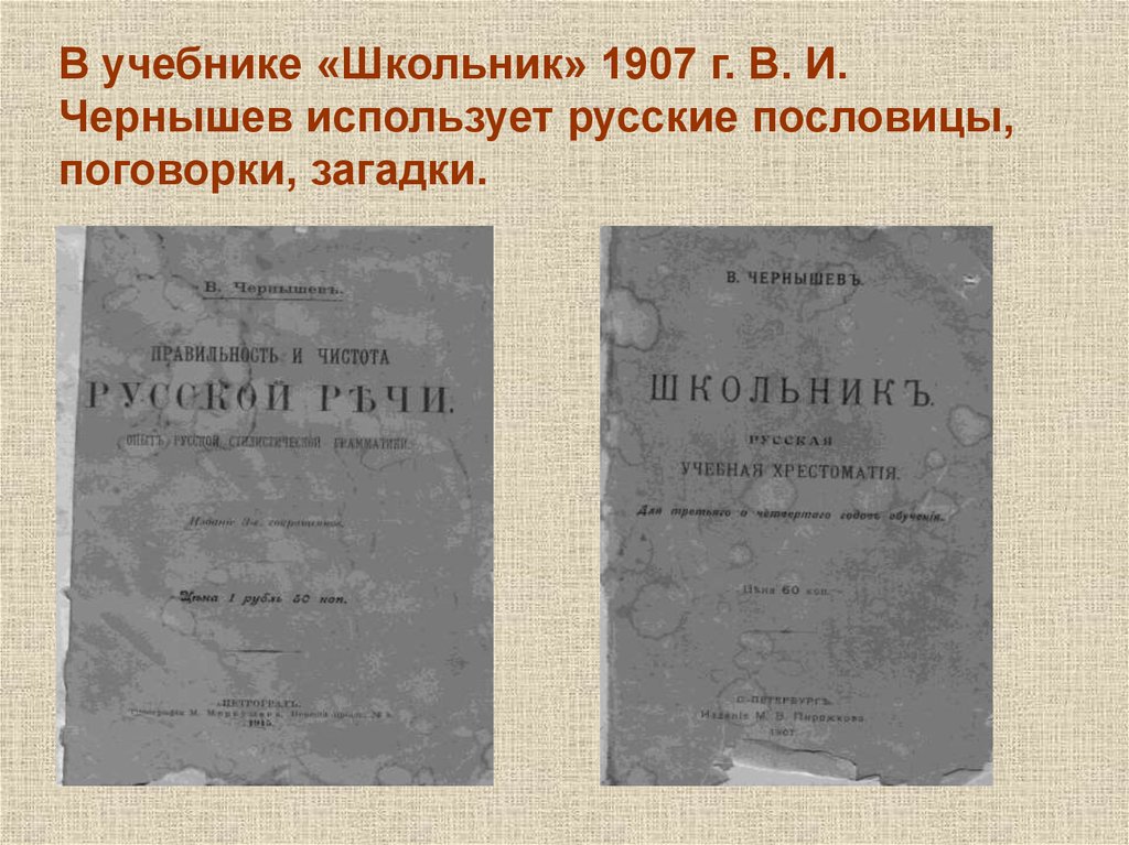 В учебнике «Школьник» 1907 г. В. И.Чернышев использует русские пословицы,