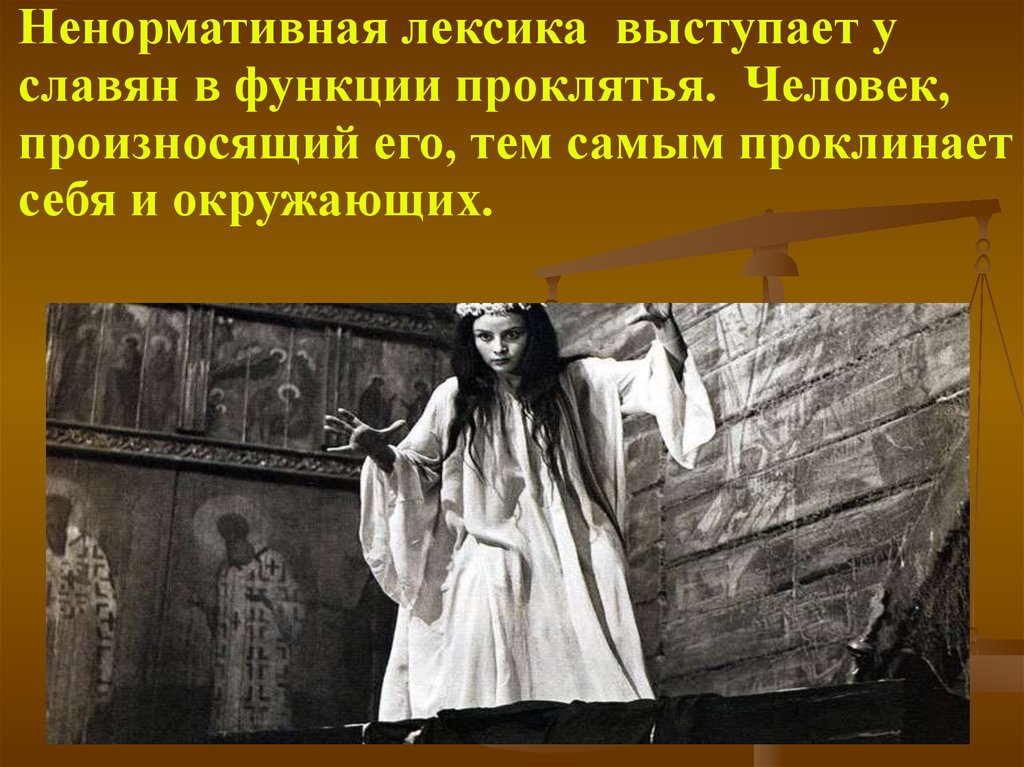 Ненормативная лексика выступает уславян в функции проклятья. Человек,