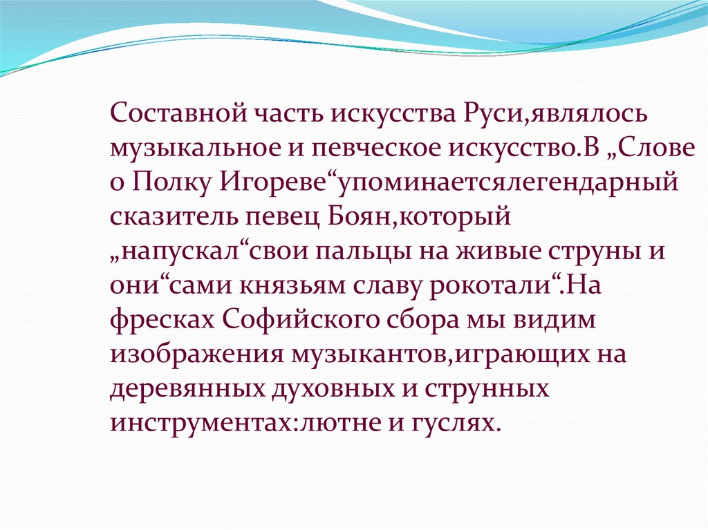 Составной часть искусства Руси,являлосьмузыкальное и певческое искусство.В „Слове