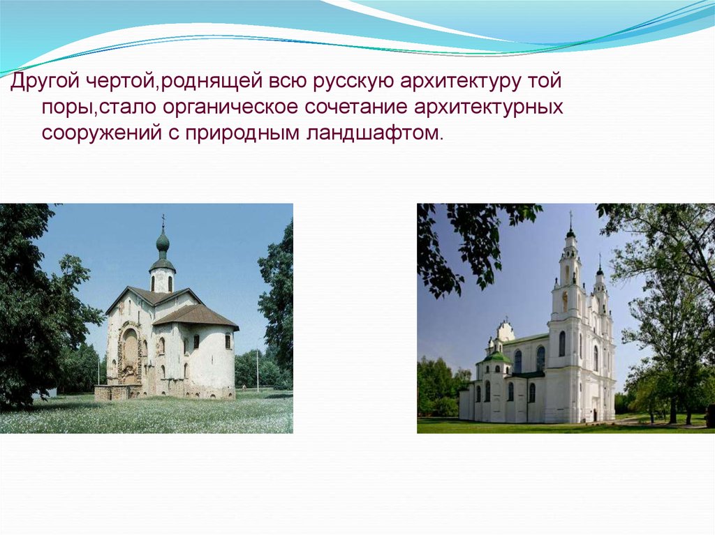 Другой чертой,роднящей всю русскую архитектуру тойпоры,стало органическое сочетание архитектурных