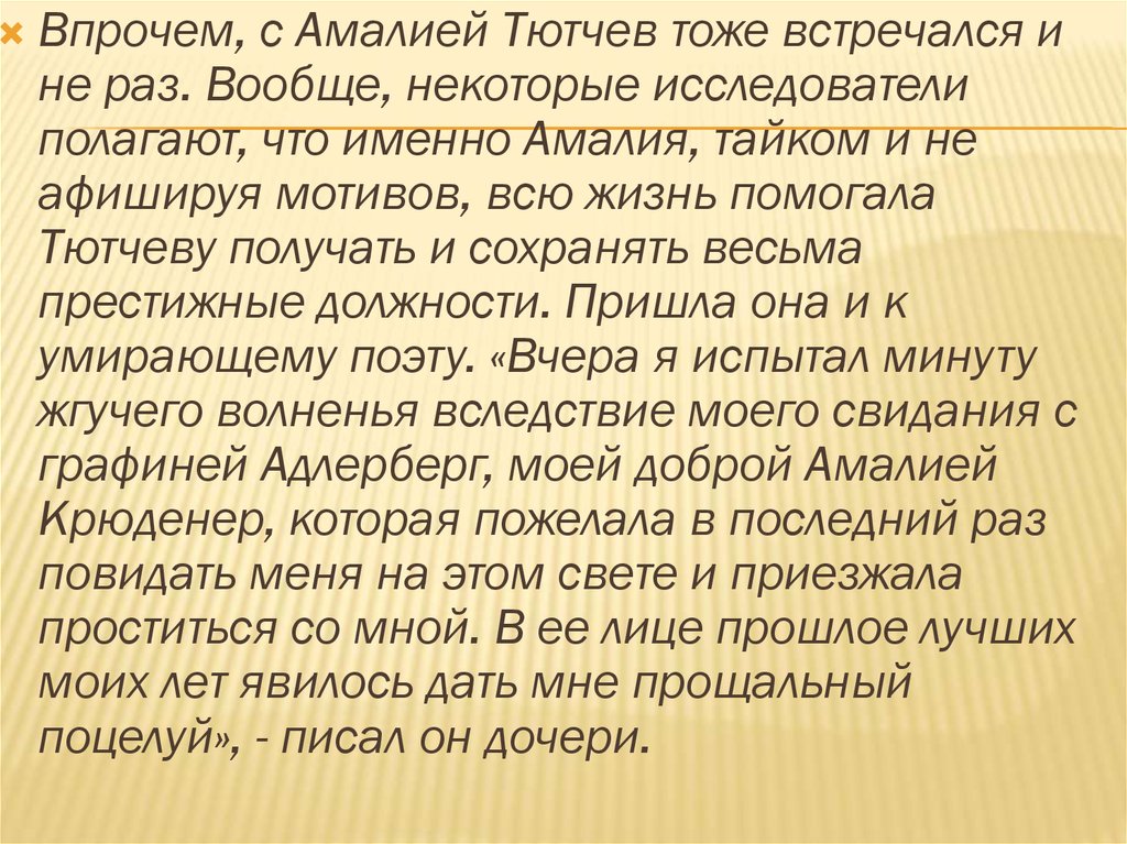 Впрочем, с Амалией Тютчев тоже встречался ине раз. Вообще, некоторые исследователи