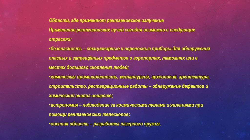 Области, где применяют рентгеновское излучениеПрименение рентгеновских лучей сегодня возможно в следующих