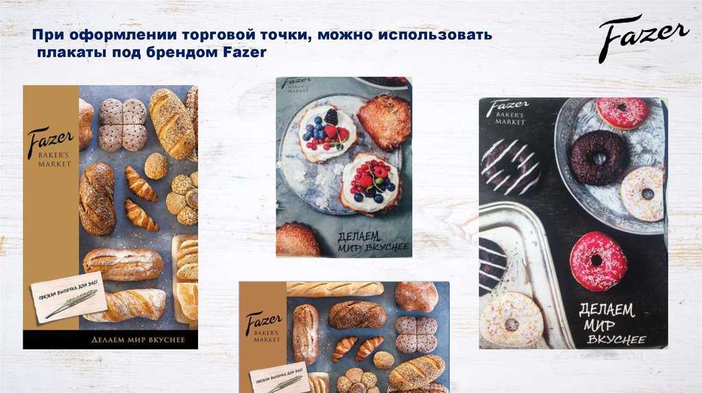 При оформлении торговой точки, можно использоватьплакаты под брендом Fazer