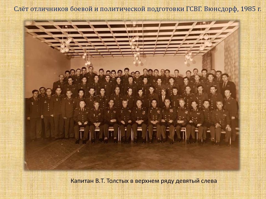 Слёт отличников боевой и политической подготовки ГСВГ. Вюнсдорф, 1985 г.Капитан В.Т. Толстых в верхнем ряду девятый слева