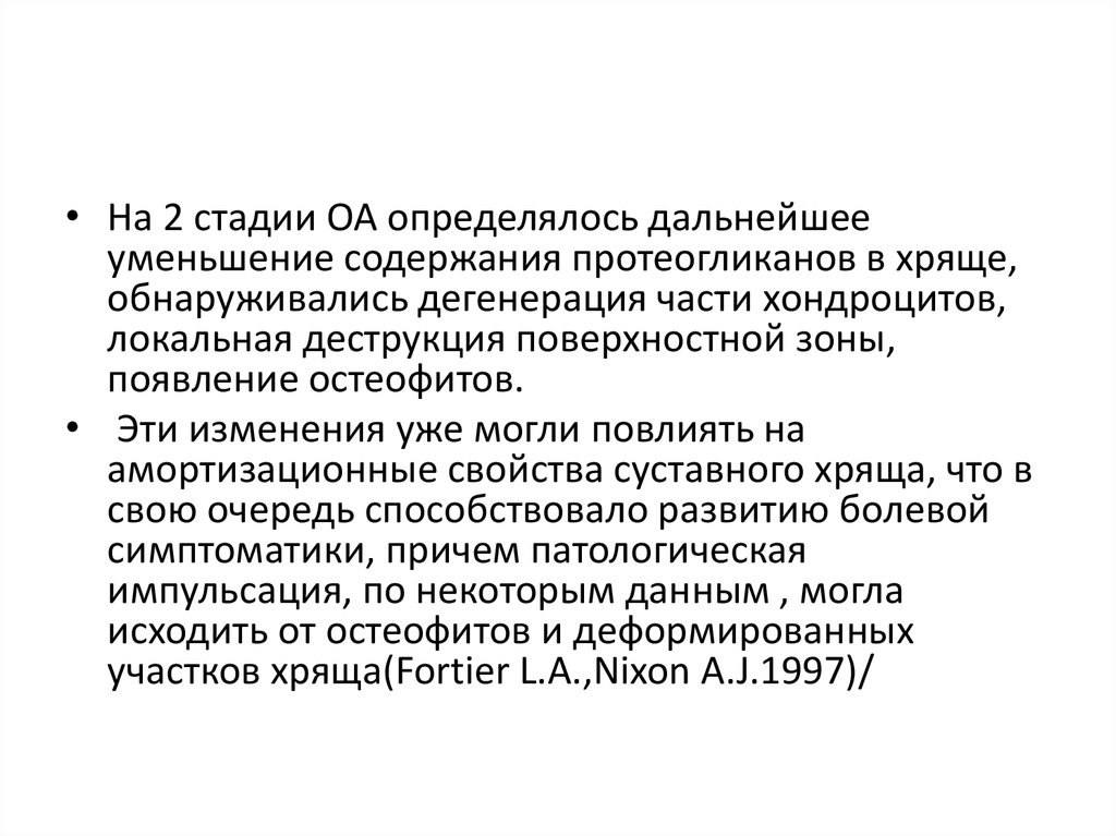 • На 2 стадии ОА определялось дальнейшееуменьшение содержания протеогликанов в хряще,