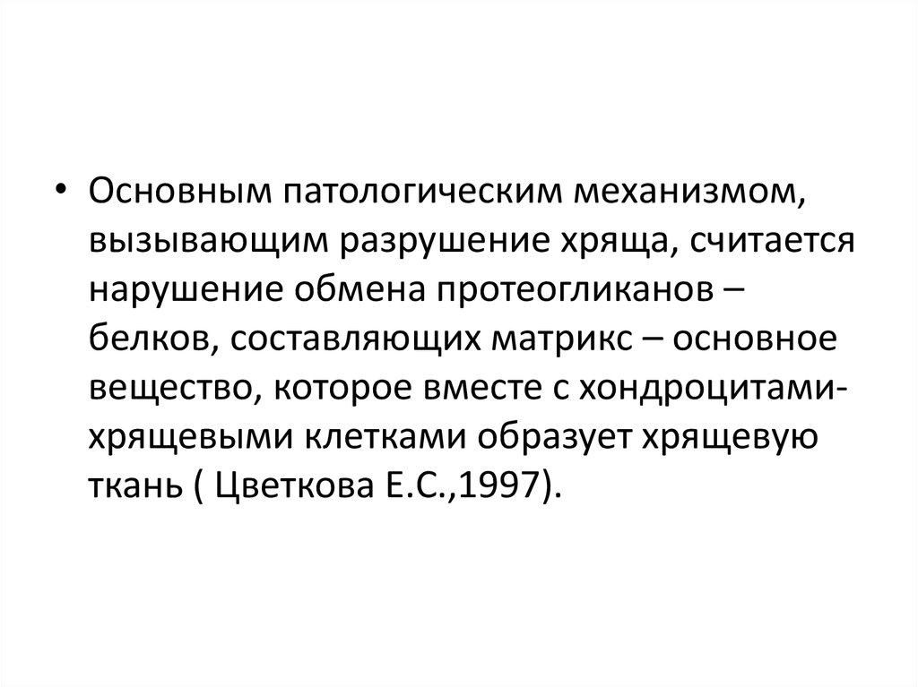 • Основным патологическим механизмом,вызывающим разрушение хряща, считается