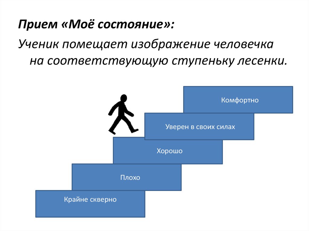 • За 3–5 минут до конца урока каждый ученик отмечает тосостояние, которое он испытывает на уроке.