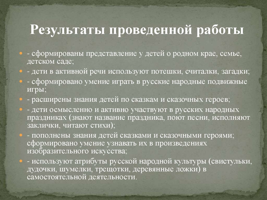 Результаты проведенной работы- сформированы представление у детей о родном крае, семье,