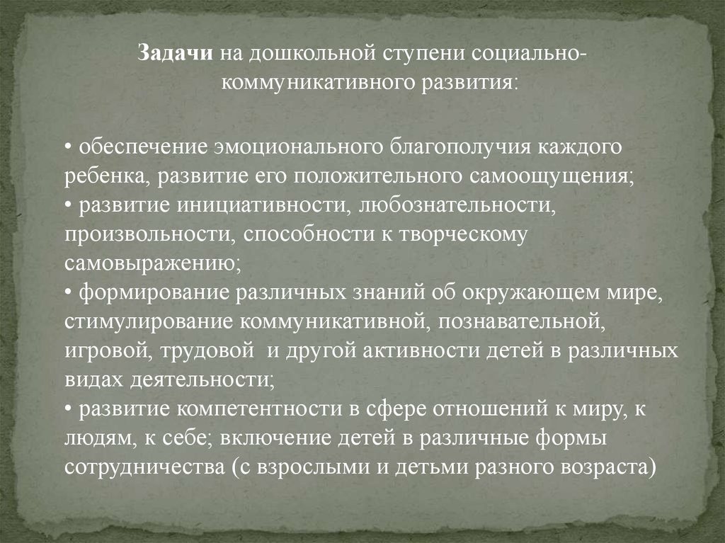 Задачи на дошкольной ступени социальнокоммуникативного развития:• обеспечение эмоционального благополучия каждого