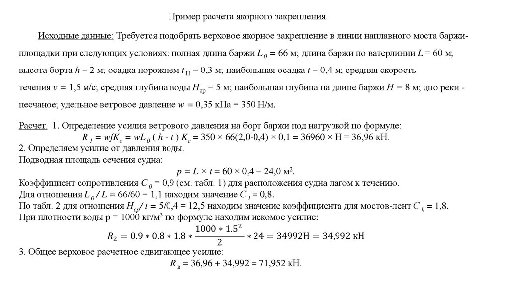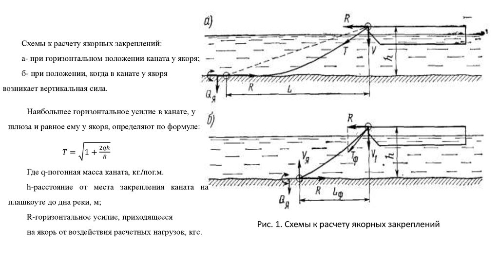 Расчет якорных креплений плавучих средств.При расчете якорных закреплений определяют усилие в якорном канате, передающееся с одной стороны на береговой или