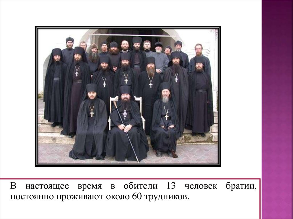 В настоящее время в обители 13 человек братии,постоянно проживают около 60 трудников.