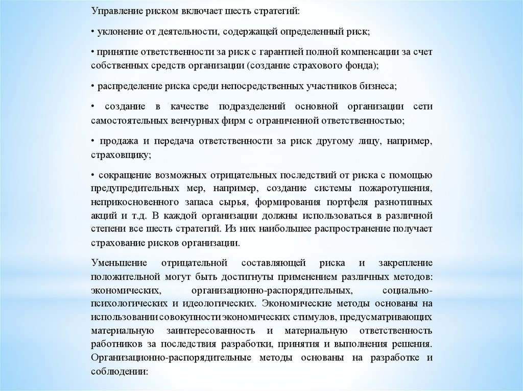 Управление риском включает шесть стратегий:• уклонение от деятельности, содержащей определенный риск;