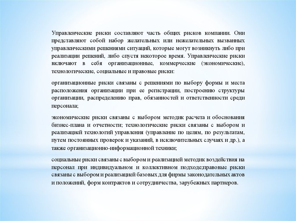 Управленческие риски составляют часть общих рисков компании. Онипредставляют собой набор желательных или нежелательных вызванных